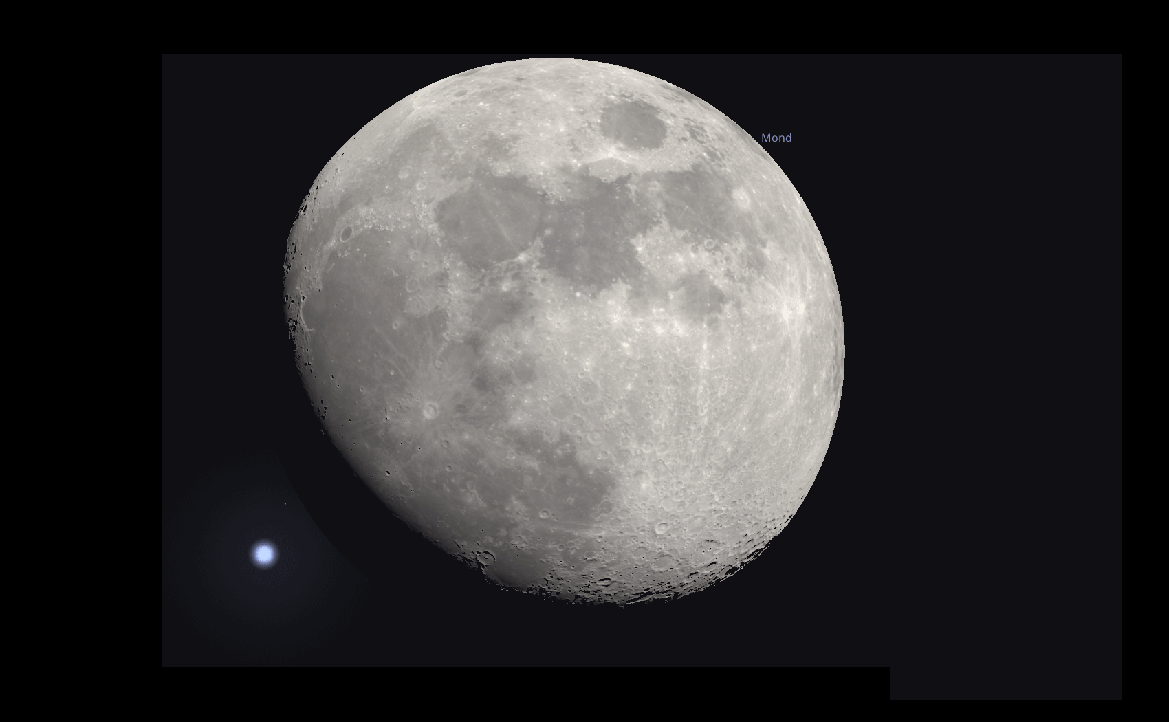 Die meisten Beobachtenden werden diese Bedeckung so erleben, dass Regulus auf den Mond zufliegt und dann in dem verschatteten Teil des Mondes verschwindet. Immer scheint sich das Kleine relativ zum Großen zu bewegen. Das lehrt die Erfahrung, es fliegt ja die Fliege um die Kuh und nicht anders herum. Die Bedeckung dauert etwa eine Stunde.