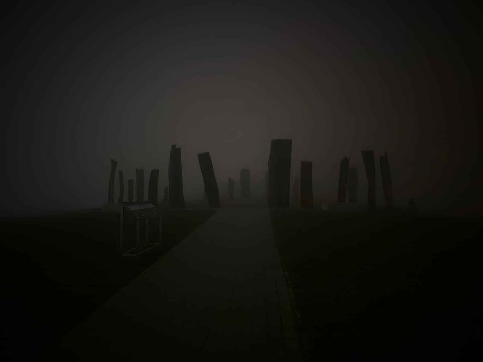 Da es eine Warnung für Polarlichter gab, kamen Marlon Mehrstedt und Leif Lennart Schade vom Olbers-Planetarium in der Nacht noch einmal zum Stelenkreis – leider alles im Nebel.