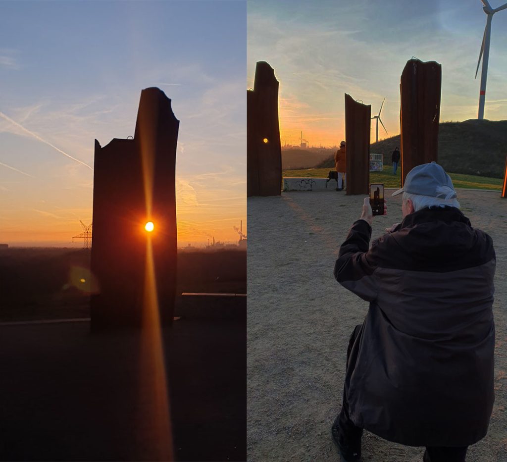 Bei bestem Wetter war die Sonne fast bis zum Untergang zu sehen. Um sie durch das vorgesehene Loch in der West-Stele beobachten zu können, musste man dann doch etwas in die Knie gehen.