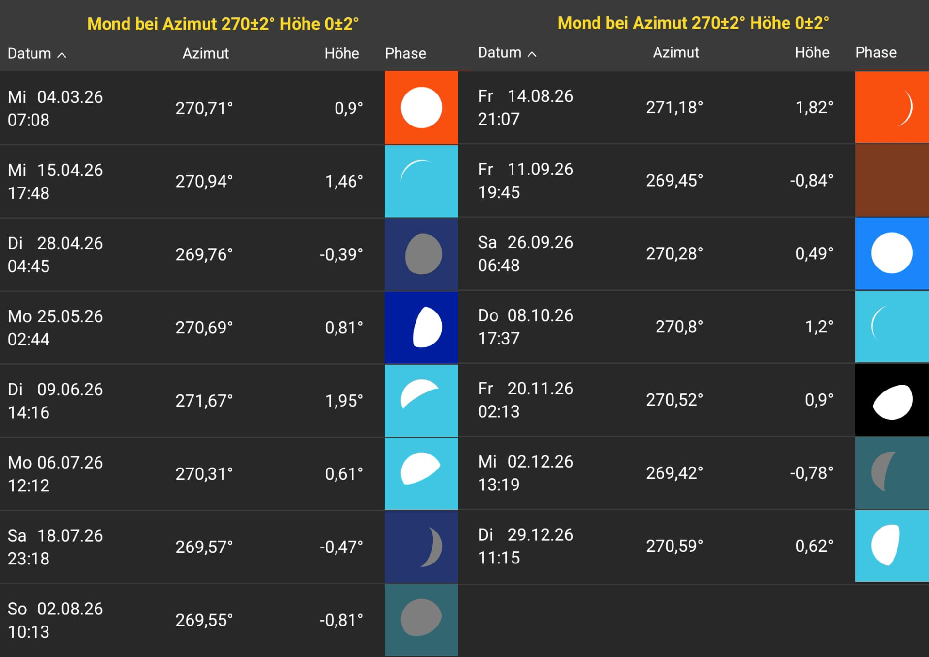 Hier die Zeiten für die restliche Passagen in diesem Jahr. Die Farben bei den Mondphasen bedeuten: