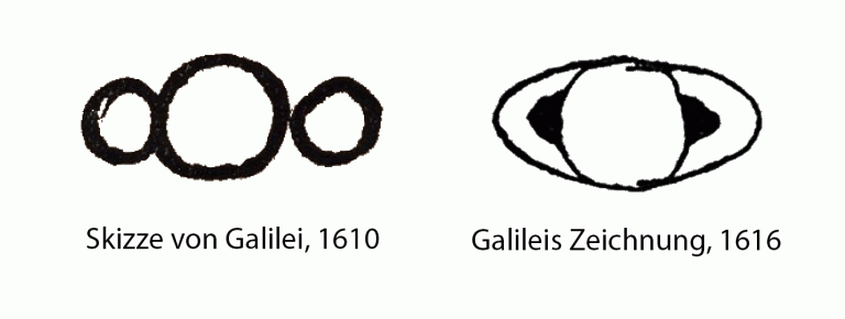 Sobald das Fernrohr 1608 erfunden worden war, richteten die Astronomen es sofort auf die Gestirne. So entdeckte Galileo Galilei im Jahr 1610 mit einem selbst konstruierten Teleskop vier Jupitermonde – die Galileischen Satelliten – und beschloss, sein neues Instrument auch zur Beobachtung des Saturn einzusetzen. Dabei sah er dessen Ringe, verstand ihre Natur jedoch aufgrund der geringen Auflösung seines Teleskops (20-fache Vergrößerung) nicht. Er sah sie als erster und zeichnete sie als zwei sehr große Monde, die den Saturn umgaben. Im Jahr 1612 verschwanden die seitlichen Kugeln scheinbar. Galilei schrieb – passend zum mythologischen Ursprung des Namens, dass Saturn „seine eigenen Kinder verschlungen hätte“. Erst 1616, als der Ring wieder deutlich sichtbar war und Galilei ein besseres Fernrohr hatte, entstand obige Skizze.