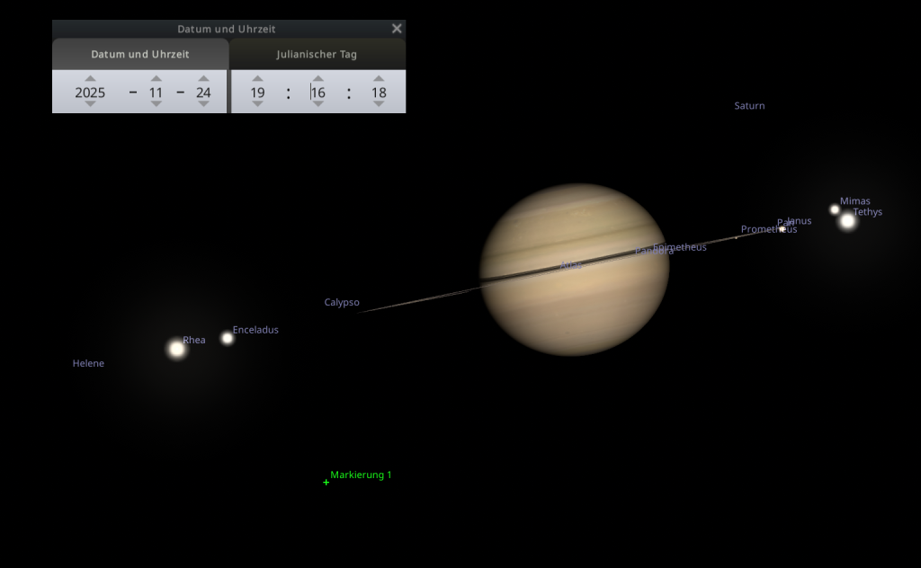 Wer in den nächsten Wochen den Saturn mit einem kleinen Teleskop beobachtet oder mit einem starken Teleobjektiv eine Aufnahme von ihm macht, wird feststellen, dass der Saturn seine Ringe fast vollständig verloren hat. Während seine Monde weiterhin leicht zu erkennen sind, so lässt sich der Ring kaum ausmachen. Das liegt daran, dass der Saturnring uns zurzeit seine Kante zeigt. Der Saturn rotiert mit leichter Neigung aber mit starrer Raumausrichtung gegenüber seiner Bahn-ebene und kreist dabei um die Sonne.